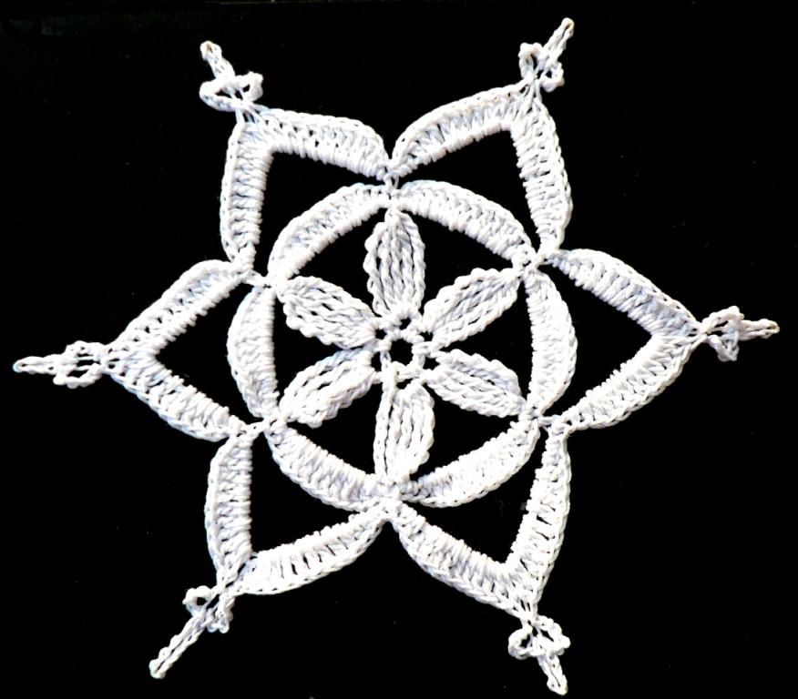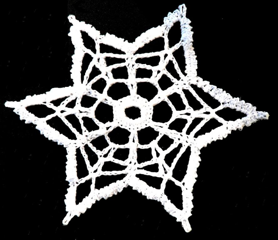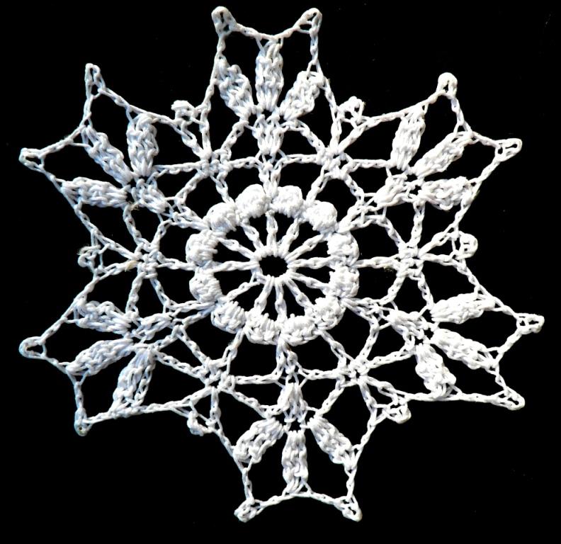 Já háčkuji rovnou podle formy, na které pak škrobím. Jednou se mi stalo, že se zvoneček nevešel na formu a neměla jsem ho pak jak vypnout, proto semtam zkusím navléknout a prostě počet sloupků i řetízkových ok přizpůsobím velikosti zvonečku, na kterém pak práci budu vypínat. Proto se stává, že výsledek neodpovídá úplně přesně fotografii zvonku, podle kterého jsem začala háčkovat.